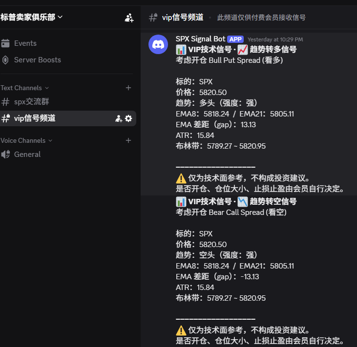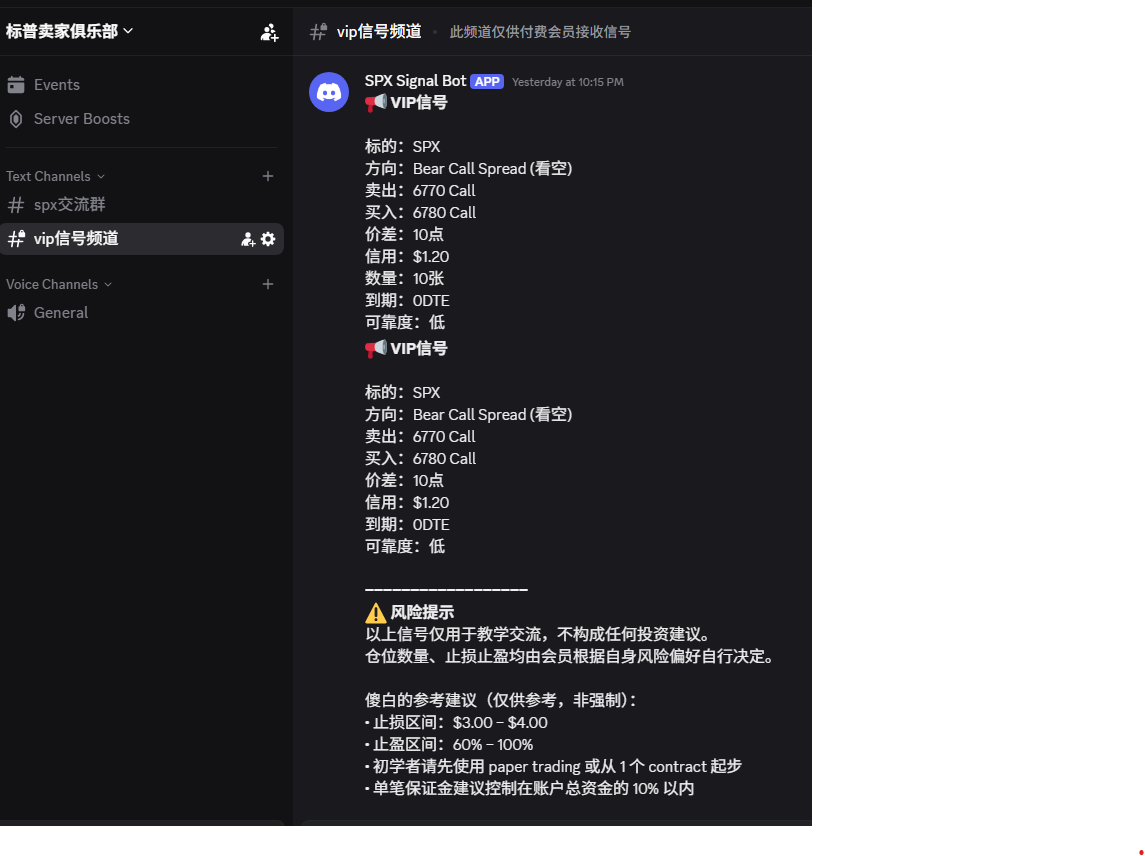 傻白的信号格式清晰、可直接下单。以下为两类实际推送:VIP 信号(含具体 Strike、到期、可靠度)与每 30 分钟的 Heartbeat 技术信号。